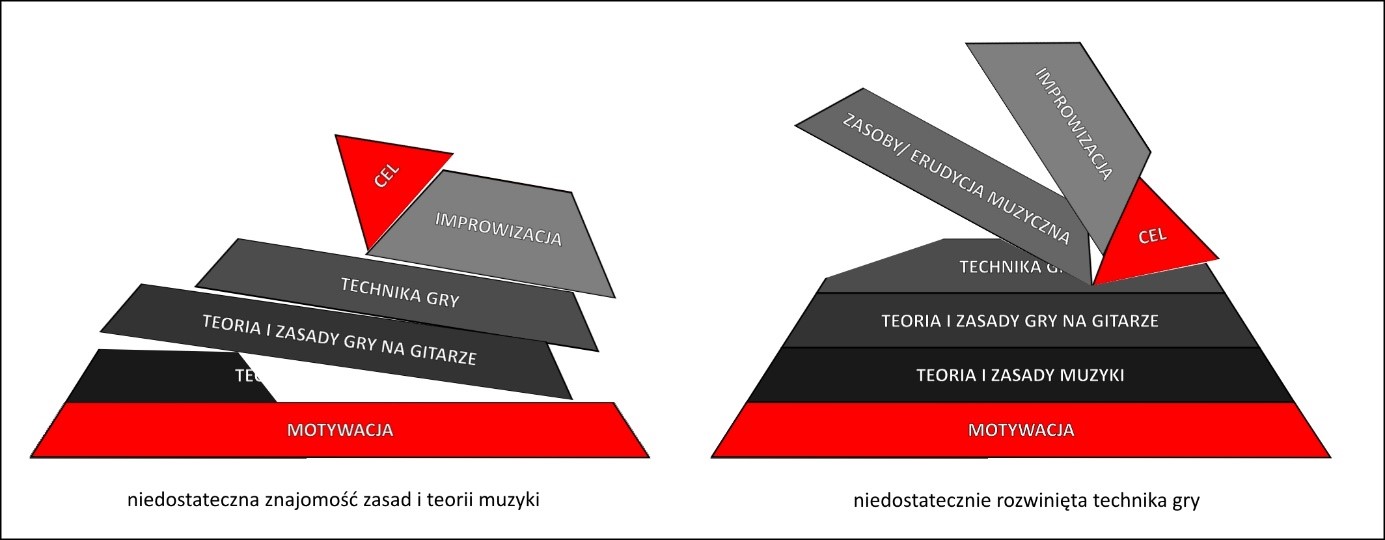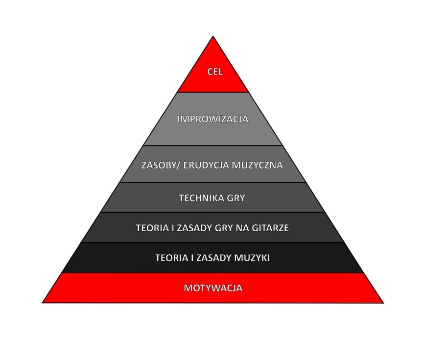 Piramida często ilustruje coś istotnego (np. piramida żywienia), ponieważ pokazuje wynikanie tego co dzieje się na wyższych piętrach z niższych poziomów. Gitarowa piramida jest propozycją właściwego ustawienia proporcji w naszych poczynaniach z instrumentem. Pokazuje że jeśli na aktualnym etapie swojego rozwoju mamy problemy z jakimś zagadnieniem, to być może  wynika ono z nieodrobienia jakiejś ważnej lekcji (patrz rysunek poniżej).